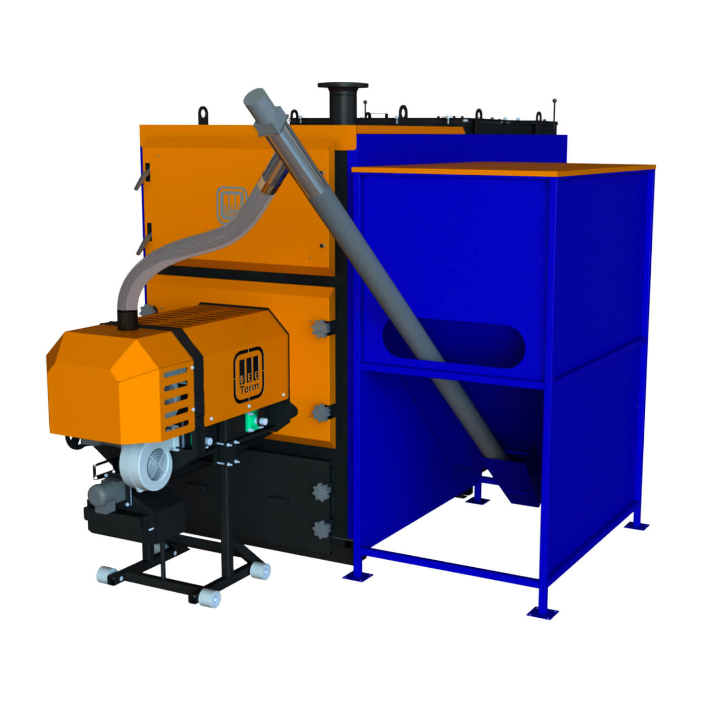 Відмінністю пелетного типу від газових та електричних котлів є наявність бункера, з якого здійснюється подача палива. Саме звідти через зовнішній шнек пелет подається в пальник. Там при організації піддуву вентилятором на колоснику відбувається її згоряння. Пелети згоряють, виділяють теплову енергію, що йде на обігрів теплоносія в жаротрубному теплообміннику, а гази, що виходять в охолодженому вигляді, виводяться через димохід. Весь процес регулюється системою автоматики.